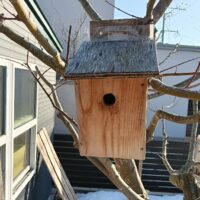 STUDIOひっぽにシジュウカラ専用の巣箱のご注文をいただきました。約15センチの四角柱の上を斜めにカットして屋根を蝶番で取り付けます。正面の板だけは鳥が留まり易いように柔らかい一枚板を使います。穴は直径28ミリ、これよ …