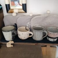出かけた先の雑貨屋さんや道の駅、陶器屋さんなどで買い集めているマグカップです。一番のお気に入りは底が丸いマグカップです。薄くて軽くて見た目以上の安定感があります。水玉のような模様も品があります。スペースが限られているので …