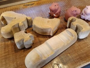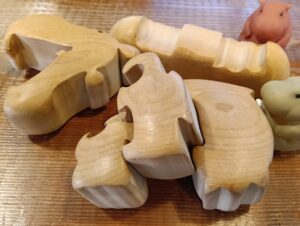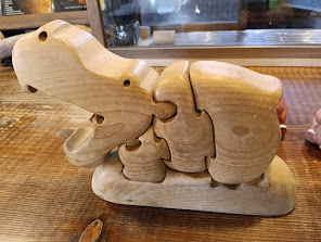 開店当初から本棚に置いてある「かばの組木パズル」。バラバラにするのは簡単なのですが、組み立てるのは意外に難しいのです。バラバラのままになっていることがよくあります。上からは入らなくて下からだとはまるように木を切っているのです。糸鋸の台を斜めにして切ったのでしょうが、匠の技ですね。