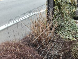 玄関わきのアナベルは毎年白い大きな花を咲かせてくれるアジサイです。悩みの種は雨です。せっかく咲いた花が雨粒の重みで首を垂れてかわいそうな状態になってしまうのです。そこで、鉄製の網をかけてその網目で支えようという作戦です。さて、うまくいくのかアナベルの成長が楽しみです。