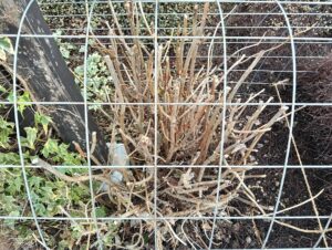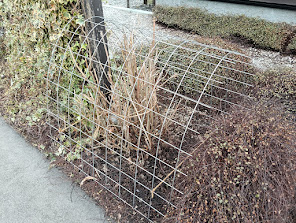 玄関わきのアナベルは毎年白い大きな花を咲かせてくれるアジサイです。悩みの種は雨です。せっかく咲いた花が雨粒の重みで首を垂れてかわいそうな状態になってしまうのです。そこで、鉄製の網をかけてその網目で支えようという作戦です。さて、うまくいくのかアナベルの成長が楽しみです。