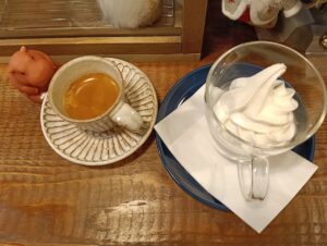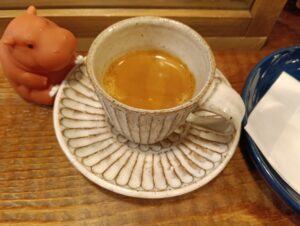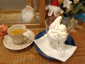 人気メニューの一つ「アフォガード」です。バニラアイスにエスプレッソ珈琲をかけていただくのが本来ですが、ひっぽにはバニラアイスがないので、ソフトクリームでお出ししています。先日、エスプレッソ用のソーサー付のカップを購入しました。なかなか素敵なカップで気に入っています。ぜひどうぞ!