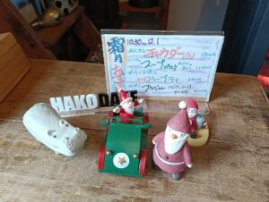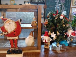 早くもクリスマスに向けて、飾りつけをしました。クリスマスツリーは開店当時から使っていますがオーナメントが少しずつ増えています。お気に入りは玄関ドアに付けている飾りで、アンティークな鈴の音が素敵です。木造りのHOHO~と言ってるサンタさんもなかなか渋いのです。もう増やせないなぁ。