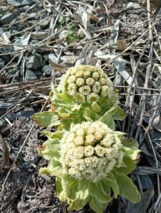 福寿草に続いてフキノトウです。春先に咲く花は可憐ですが、食べるのも限度があり伸びすぎると厄介者になってしまいます。そういうことで庭にはなくて、こちらのフキノトウは近所の空き地に咲いていた花です。フキノトウを見ると「春になったなぁ」と実感できてほっこりします。