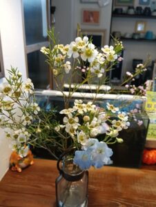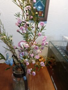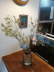 今週のカウンターの花は「ヨウバナタンピン」です。聞き慣れない名前ですが、どんな花にも名前はあるということですね。ピンク色の花はこれから開花してくれそうです。切り花を保たせる薬もよく花屋でもらいますが、毎朝水を替えて氷を入れておくのが一番のようです。仕事が増えますな。