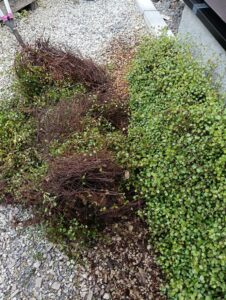 伸びすぎて広がり過ぎたワイヤープランツを刈り取りました。かなり生命力の強い植物で、どんどん広がり切ってみると木の枝のような茎が伸びています。数年でも放置していると家全体が飲み込まれそうです。おそらくアイビーに匹敵する強さだと思います。積雪の前にもう何か所か刈り取るつもりです。