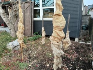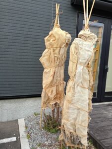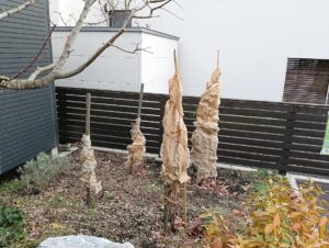 毎年の恒例「冬囲い」です。コデマリは囲ってやらなくても、冬を越すのは容易だと思うのですが、木枯らしの中可哀そうだと一枚着せてあげます。ブルーベリーは、そこの場所に🅿の雪を飛ばしますので、その重さから守ってあげなくてはなりません。念入りに枝が折れないようにしっかりと「冬囲い」です。