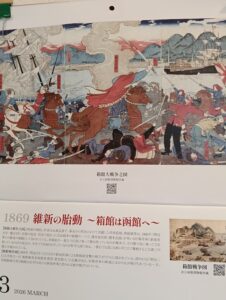 弥生三月に入りました。今朝の久しぶりの朝日に、思わず外で伸びをしました。気持ちも春に向かってスキっとしました。カレンダーは箱館戦争の錦絵です。当時の浮世絵師が描いたそうですが土方歳三も描いてあり、戦いの壮絶さがよくわかります。よく残っていたものですね。