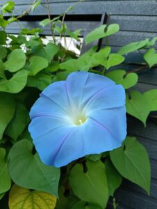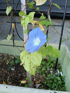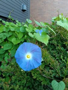 季節外れの朝顔が咲き続けています。今朝の開花は直径10センチほどの大輪が5輪、朝咲いて夕方にはしぼんでしまう一日だけの開花です。蕾の時は先が赤っぽいのですが開くと鮮やかな水色になります。夕方には赤みを帯びていきます。この先、違う種類の朝顔が咲いてくれるといいなと水やりしています。