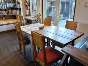 冬の薪ストーブ営業が終わったので、模様替えをして夏季営業の配置にしました。使っていたテーブルを一つ、ストーブ台の上にあげたので店が広くなったような気がします。ストーブ席の横長テーブルは窓際の二人席になりました。カウンター席3、椅子席6、小上がり席2、計11席の小さいひっぽです。