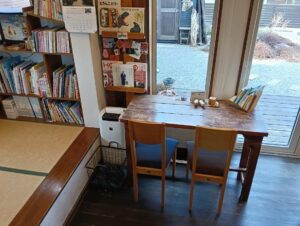 冬の薪ストーブ営業が終わったので、模様替えをして夏季営業の配置にしました。使っていたテーブルを一つ、ストーブ台の上にあげたので店が広くなったような気がします。ストーブ席の横長テーブルは窓際の二人席になりました。カウンター席3、椅子席6、小上がり席2、計11席の小さいひっぽです。
